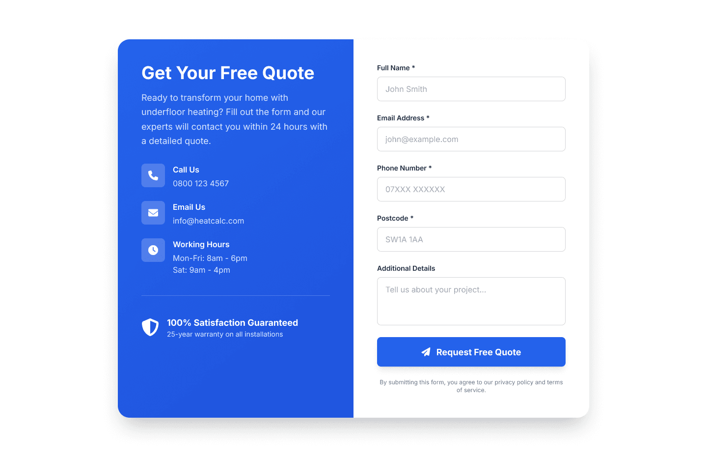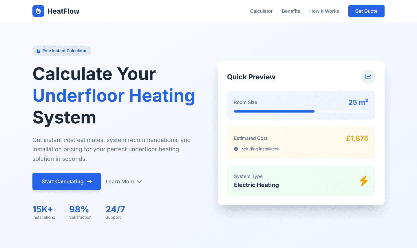 I designed HeatFlow as a focused underfloor heat calculator that simplifies complex calculations into a clear, step-by-step experience. The interface guides users through essential inputs such as room size, insulation level, and flooring type, then presents results in an easy-to-understand format. A clean layout, minimal distractions, and clear labels ensure the tool is approachable for both professionals and non-technical users.