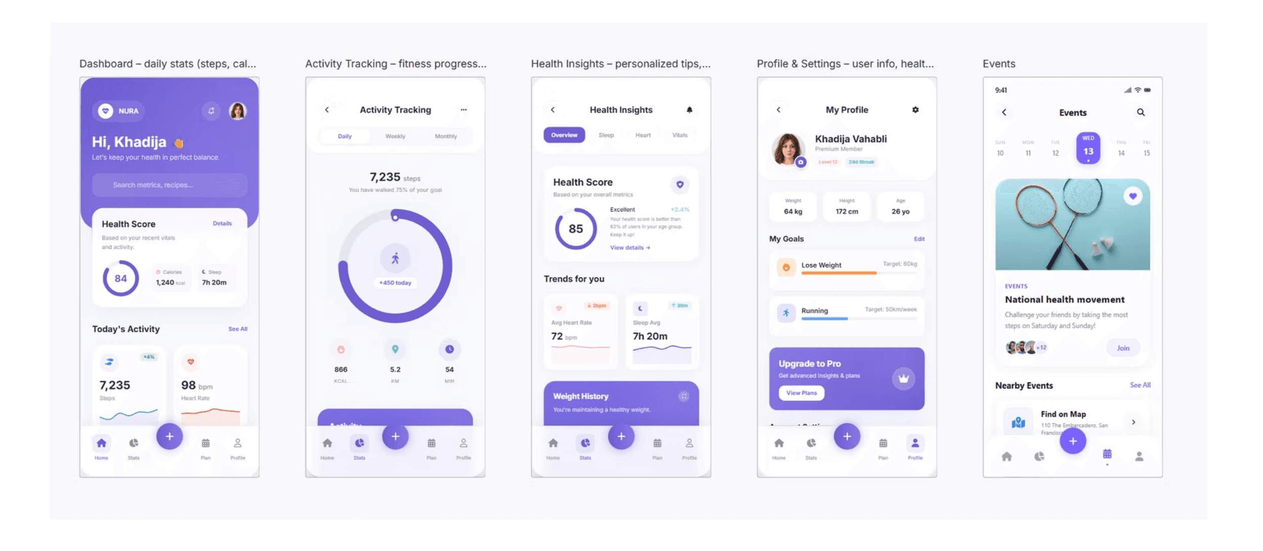Nura was designed as a calm, user-centered health and fitness app that focuses on clarity and balance. The app translates health and activity data into simple, actionable insights while encouraging consistent habits through gentle motivation. A minimal interface, soft visual language, and clear hierarchy help users stay focused without feeling overwhelmed.