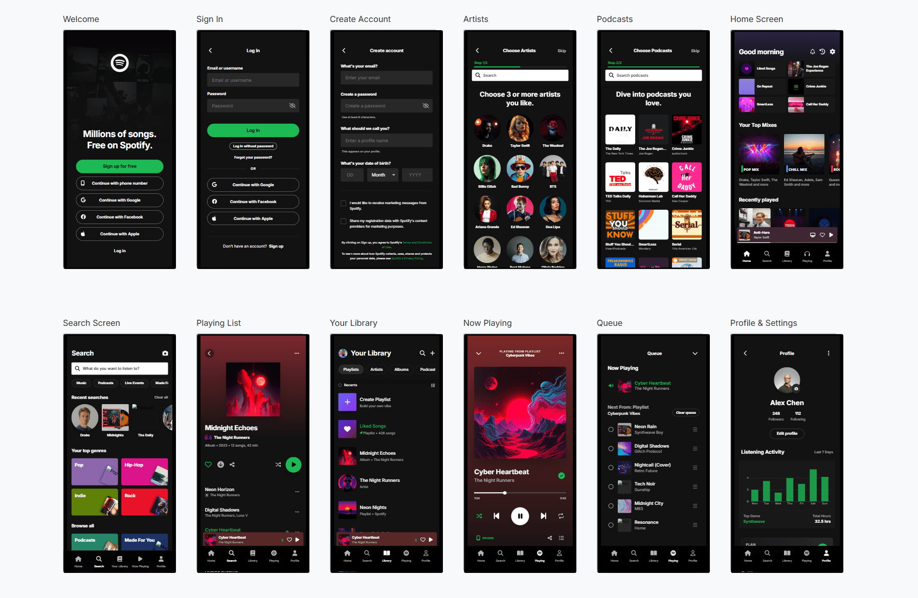 Redesigned the Spotify app interface, focusing on improved usability, navigation, and visual consistency.